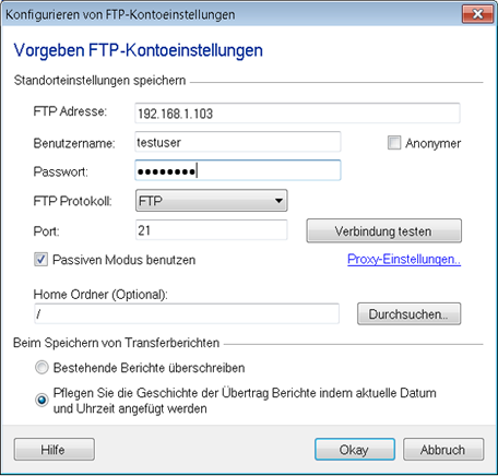 FTP Ein entfernter Standort ist immer die sicherste Option zum Speichern der wichtigen Daten. Ihr Übertragungsbericht kann auf dem FTP-Server gespeichert werden. Sie müssen lediglich Ihre FTP-Verbindungsdetails angeben und Ihr Übertragungsbericht ist geschützt. FTP-Verbindungsdetails enthalten den Servernamen oder die FTP-Adresse, den Benutzernamen, das Kennwort, die Portnummer und den Zielordner auf dem Server.