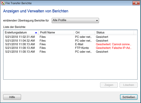 Hinweis: Alle Transferberichte, die zuvor im lokalen oder Netzwerkordner, FTP - Konto und E - Mail - Konto gespeichert wurden, werden in der Liste aufgeführt Dateiübertragungsberichte Dialog.