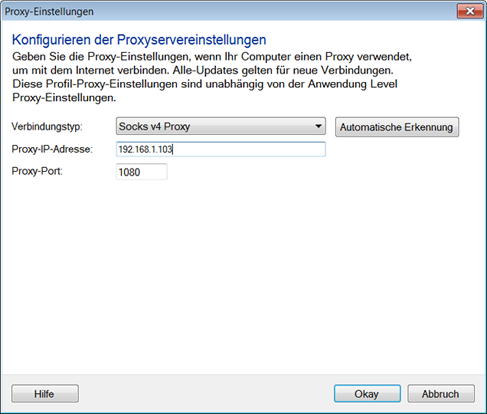 Wenn Sie die Proxy-Details nicht kennen, können Sie auf die Option Automatische Erkennung klicken. Diese Option erkennt die im Internet Explorer konfigurierten Proxy-Einstellungen und zeigt sie in den entsprechenden Feldern an. Wenn dies nicht funktioniert, müssen Sie möglicherweise Ihren Netzwerkadministrator um Unterstützung bitten