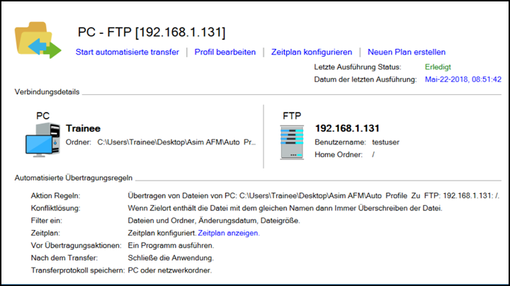 Die Profilinformationsseite zeigt die Informationen zu Ihrem Profil an, z. B. den Übertragungstyp, die Quelle, den Zielspeicherort und das zuletzt verbundene Datum. Um die Verbindungseigenschaften anzuzeigen, klicken Sie mit der rechten Maustaste auf ein Profil von Verbindungsprofil-Panel und wählen Sie Profil Information.