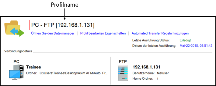 - Letzte Verbindung: Zeigt das Datum und die Uhrzeit an, wann der diesem Profil zugeordnete Dateimanager zuletzt geöffnet wurde. Wenn der zuletzt geöffnete Datei-Manager nicht verbunden war, wird der Status als Nicht erfolgreich angezeigt.