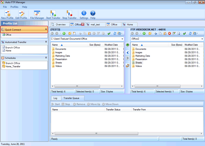 Sie können eines Profils und schnelle Verbindung übertragen Sie Dateien zwischen zwei PC-Ordner, FTP-Server und PC-Ordner oder zwei FTP-Servern haben.