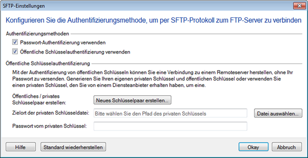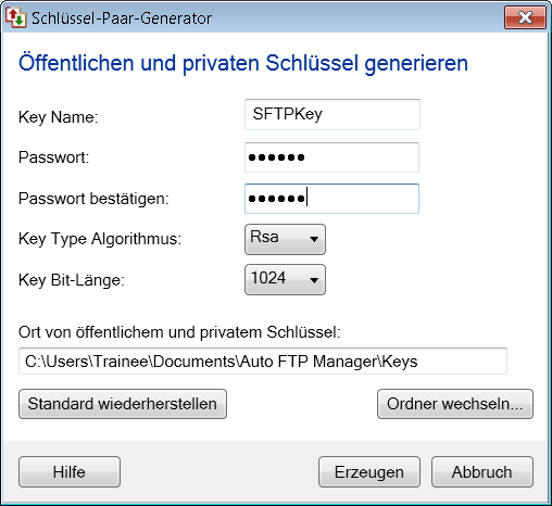 In dem Schlüsselpaar-Generator Dialog können Sie Ihren eigenen öffentlichen und privaten Schlüssel für SFTP-Verbindungen erstellen.