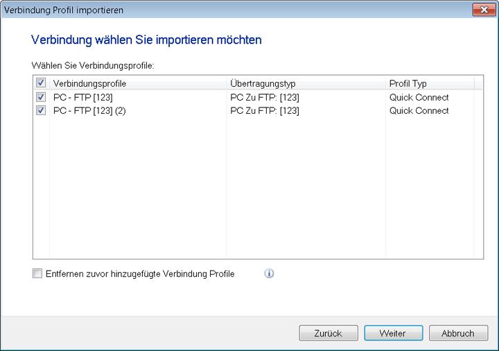 Standardmäßig werden alle Verbindungsprofile überprüft. Sie können die Profile auswählen, die Sie ausschließen möchten, indem Sie sie deaktivieren. Um diese Verbindungsprofile mit allen vorhandenen Verbindungsprofilen hinzuzufügen, deaktivieren Sie das Kontrollkästchen Entfernen Sie zuvor hinzugefügte Verbindungsprofile Möglichkeit.