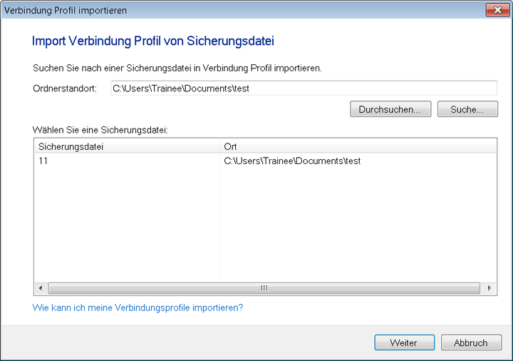 Im Dialogfeld Verbindungsprofil importieren müssen Sie den Speicherort des Sicherungsordners angeben. Nach dem Angeben des Ordners sehen Sie eine Liste der Sicherungsdateien darin. Wählen Sie eine Datei und klicken Sie auf Nächster