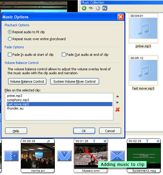 Musik hinzugefügt werden kann Clips per Drag & Drop audio-Dateien von der Musik-Sammlung um einen Clip auf dem Storyboard. Sie können Musik auch hinzufügen, indem Sie einen Clip auf dem Storyboard (indem Sie darauf klicken) und dann mit der rechten Maustaste auf die audio-Datei hinzugefügt werden und Storyboard hinzufügen. Würden Sie ausgewählten Clip oder den letzten Clip Sie, d. h. gearbeitet die Musik hinzugefügt werden ein durch ein gepunktetes Rechteck um ihn herum.
