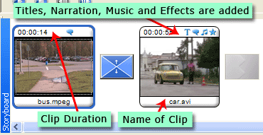 Wenn nichts zum Storyboard hinzugefügt wurde, werden die leeren Zellen Clip und Übergang grau. Wenn Sie die Maus über sie, wird Pop-up Hilfe, die Sie was wo hinzugefügt werden können. Sobald ein Clip oder ein Bild wird auf dem Storyboard und Sie bewegen Sie die Maus über der oberen rechten Ecke (neben der Dauer des Clips), sehen Sie grau Icons für Titel, Erzählung, Musik und Effekten. Die Symbole für diese Features werden in blau angezeigt, wenn sie auf einen Clip hinzugefügt wurden. Siehe Abbildung 2.