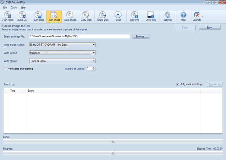 An der Unterseite der Anwendung zeigen die Indikatoren den Status der Brennvorgang. Die Puffer zeigt, wie viel Daten bereit, um die Disc zu schreiben. Wenn dieser Indikator zu niedrig sinkt, besteht die Gefahr der CD Erstellung Prozess scheitern. Wenn diese Situation auftritt, reduzieren die Schreibgeschwindigkeit. Wenn Sie klicken Brennen Wird das Event Log in jeder Phase des Brennvorgangs aktualisiert.
