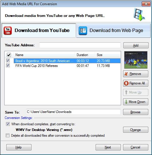 | Digital Media Converter Pro: Hinzufügen von Mediendateien von YouTube | Hinzufügen von Mediendateienvon YouTube Es ist sehr leicht zu Mediendateien aus mithilfe Digital Media Converter Pro von YouTube herunterladen. Sie können Web-Medien für die Konvertierung oder einfach anzeigen hinzufügen. Klicken Sie auf Medien von YouTube herunterzuladen, Datei >> Hinzufügen von Web-Media  Ein YouTube-Video herunterladen, geben den URL, und klicken auf die Hinzufügen -Taste.Dies extrahiert die Medien-Datei-Informationen wie die Größe der Datei-Name, Dauer, undMiniaturansicht Fügen Sie es zum Download. Konvertierungseinstellungen Wenn der Download abgeschlossen ist, starten Sie zu konvertieren: Wenn diese Option aktiviert ist, es wird automatisch die heruntergeladenen Dateien in der Konvertierung-Liste hinzufügen und die Umwandlung in das ausgewählte Format wird gestartet werden, wenn der Download erfolgreich abgeschlossen ist. Sie können das Ausgabeformat für die Datei ändern und seine Konvertierungseinstellungen durch Klicken auf ändern -Taste. Löschen Sie alle heruntergeladene Dateien, nachdem die Konvertierung erfolgreich abgeschlossen wurde: Wenn diese Option aktiviert ist werden dann alle heruntergeladenen Dateien nach seine erfolgreiche Konvertierung gelöscht. Herunterladen von Medien Die Media-URL zu suchen, klicken Sie auf Weiter Schaltfläche, um den Download der Dateien zu beginnen. |
