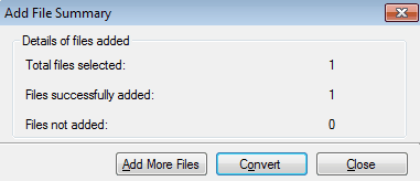 Das Datei-Zusammenfassung hinzufügen Dialog wird angezeigt, wenn alle Dateien von der Datei Test Engine analysiert werden. Die Zusammenfassung zeigt die Anzahl der ausgewählten Dateien, die erfolgreich hinzugefügten Dateien und die Dateien, die nicht hinzugefügt werden.