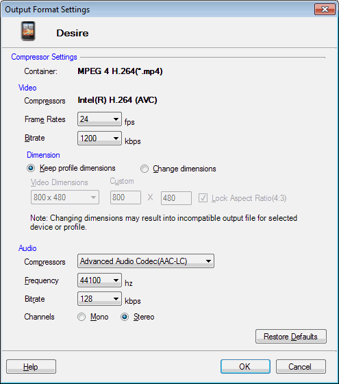 Ihre Mediendateien werden in MPEG-4-Format konvertiert. Das Intel (R) H.264 (AVC) Kompressor nimmt weniger Platz als andere Kompressoren für gleiche Qualität. Die Bildrate ist auf eingestellt 24 fps Und Bitrate ist 1200 Kbps. Sie können wählen, um die Video-Dimensionen zu bewahren oder zu ändern.