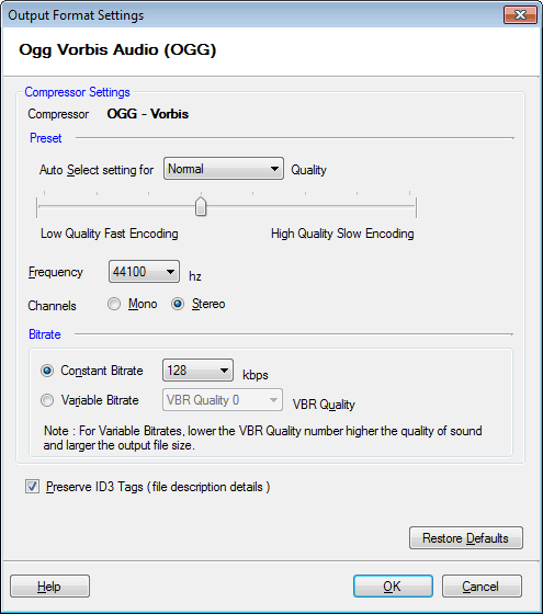 Einige eingebaute Ogg Vorbis Voreinstellungen sind entworfen, um die bestmögliche Qualität und Dateigröße zur Verfügung zu stellen. Sie wurden mit rigorosen Hörversuchen abgestimmt. Diese Voreinstellungen werden für jede benutzerdefinierte Menge von Parametern sehr empfohlen. Die Voreinstellung ist die Normal Voreingestellt Um ein Preset zu verwenden, wählen Sie es aus Auto Select Einstellungen für Liste oder ziehen Sie den Schieberegler. Höhere Qualität Kodierung dauert länger als niedrigere Qualität.