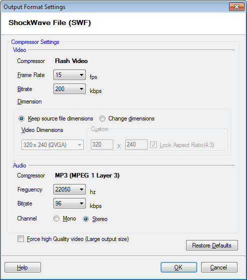 Standardmäßig ist der ausgewählte Kompressor Flash Video. Die Bildrate ist eingestellt 15 fps, Bitrate bei 200 kbps. Sie können wählen, ob Sie die Abmessungen des Videos behalten oder ändern möchten.