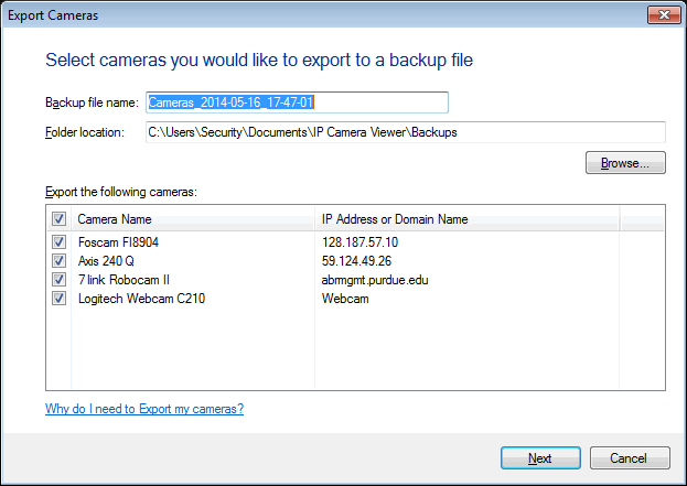 In dem Export-Kameras Dialog, sehen Sie eine Liste der Kameras derzeit in Anwendung hinzugefügt. Es zeigt auch die IP Adresse oder Domain Name. Standardmäßig werden alle die Kamera (s) geprüft. Sie können die Kameras wählen Sie aus der Sicherung ausschließen wollen durch Abwahl der Kontrollkästchen. Sobald Sie fertig sind, klicken Sie auf Nächster Schaltfläche, um eine Backup-Datei zu erstellen.