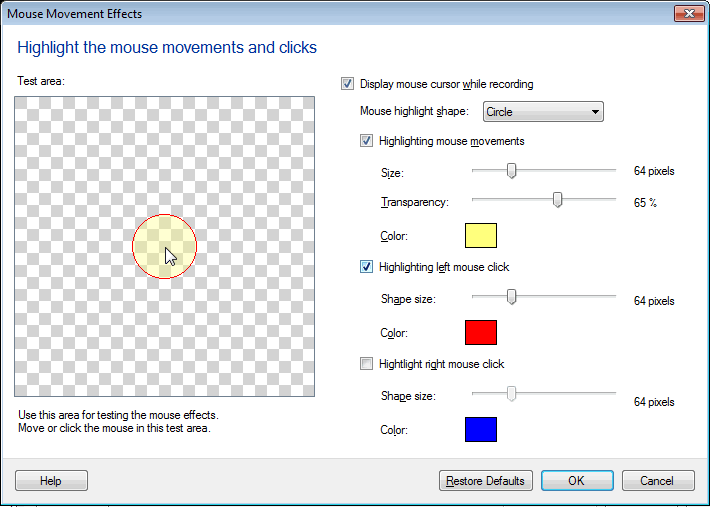 Das Hervorheben von Mausklicks kann hilfreich sein, wenn Sie eine Demonstration erstellen. Sie können wählen Markieren der linke Mausklick, der rechte Mausklick oder beides. Um den linken und den rechten Mausklick zu unterscheiden, können Sie für jeden Klick verschiedene Farben und Größen festlegen. Sie können den Testbereich verwenden, um die Einstellungen der Effekte zu testen und zu bestätigen.