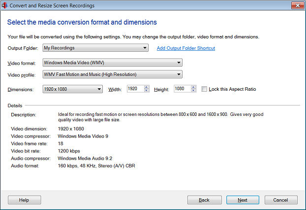 Möglicherweise gibt es Programme, die das Format Ihrer Aufnahme nicht unterstützen. Um solche Probleme zu beheben, können Sie Ihre Mediendateien in ein geeignetes Format konvertieren. Das Konvertierungsassistent können Sie Ihre Bildschirmaufnahmen in WMV, AVI, WebM oder H.264 (MP4) -Format für die einfache Freigabe konvertieren.