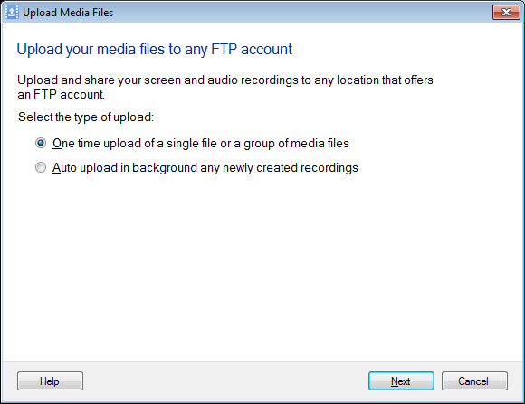 Der erste Schritt besteht darin, die Upload-Methode anzugeben. Du kannst wählen Einmaliges Hochladen einer einzelnen Datei oder einer Gruppe von Mediendateien Option und führen Sie eine schnelle Übertragung durch oder wählen Sie Alle neu erstellten Aufnahmen automatisch im Hintergrund hochladen Option und lassen Sie My Screen Recorder Pro automatisch eine Datei gemäß den konfigurierten Einstellungen hochladen.