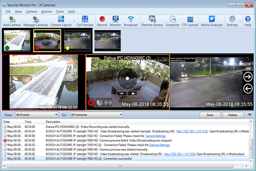 Security Monitor Pro bietet die Möglichkeit, Videoaufzeichnungs- und Überwachungsaktionen für einzelne Kameras unabhängig voneinander zu konfigurieren. Wenn Bewegung erkannt wird, können Sie das Programm so konfigurieren, dass eine Videoaufzeichnung des Ereignisses erstellt, Fotos aufgenommen, ein Alarm ausgelöst oder eine E-Mail-Benachrichtigung gesendet wird.Sie können die Fotos automatisch auf Ihre Website hochladen oder ein Backup der aufgenommenen Videos und Fotos in Ihrem FTP-Konto speichern.