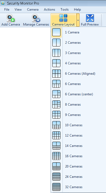 Ordnen und logisch gruppieren Sie das Vorschaufenster mit verschiedenen Kamera-Layouts.Es werden 16 verschiedene Kamera-Layouts unterstützt.Klicken Ansicht >> Kameralayout oder der Kamera-Layout Symbol in der Symbolleiste.
