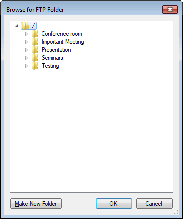 Das Dialogfeld FTP Folder Browser zeigt eine Verzeichnisliste in einer Baumstruktur an.Der vom Server angegebene Standard-FTP-Ordner wird vom Stammverzeichnis angegeben, dh '/'.Mit können Sie einen neuen Remote-Ordner erstellen Neuen Ordner erstellen Taste.Wenn Sie den gewünschten FTP-Ordner ausgewählt haben, klicken Sie auf OK.
