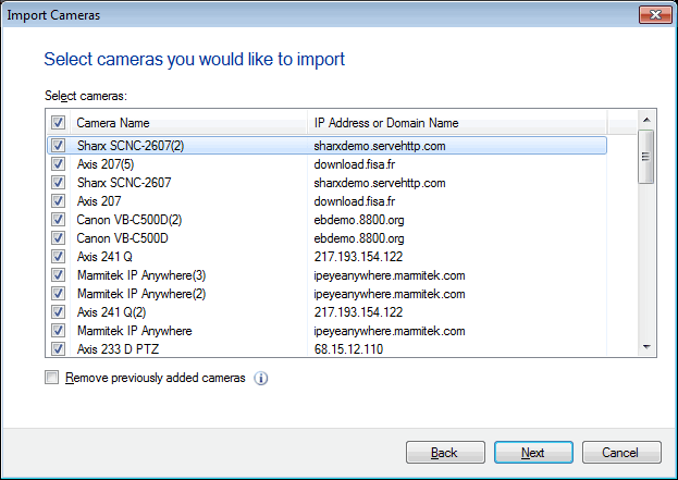 Standardmäßig werden alle Kameras geprüft.Sie können die Kameras auswählen, die Sie ausschließen möchten, indem Sie die Kontrollkästchen deaktivieren.Wenn Sie die Kameras aus der Sicherungsdatei hinzufügen und die zuvor hinzugefügten Kameras beibehalten möchten, deaktivieren Sie die Auswahl Entfernen Sie zuvor hinzugefügte Kameras.