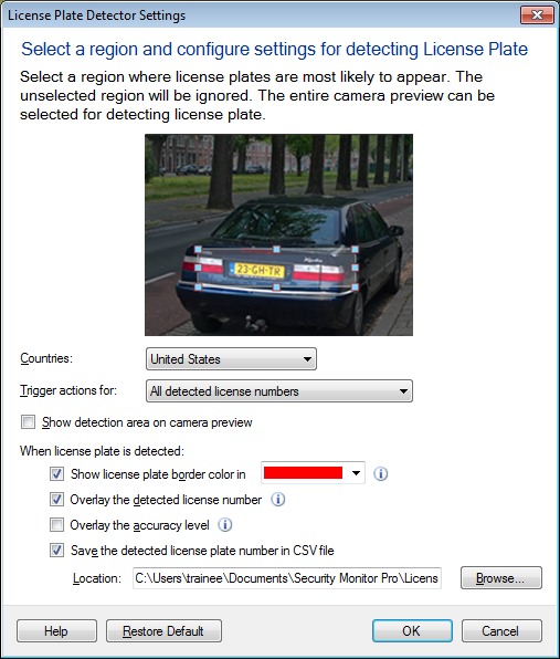 Benutzen Speichern Sie das erkannte Kennzeichen in der CSV-Datei Option zum Speichern aller erkannten Kennzeichen mit Datum, Uhrzeit, Land und Genauigkeit.