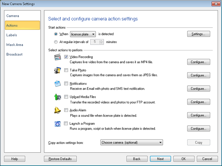 Klicken Sie auf, um eine Warnmeldung auszulösen, wenn ein Nummernschild erkannt wird Kamera >> Kameras verwalten >> Kamera bearbeiten >> Aktionen und wählen Sie die Option Wenn ein Nummernschild erkannt wird.