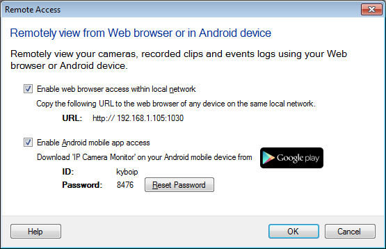 Wenn Sie diese Option aktivieren, notieren Sie sich die ID und das Kennwort, um eine Remote-Verbindung von Ihrem Android-Mobilgerät herzustellen. Herunterladen IP Camera Monitor aus dem Google Play Store und geben Sie die Anmeldedaten in die Anwendung ein.