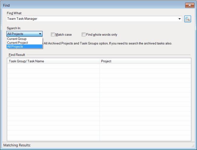 Hinweis: Wenn Zeigen alle archivierten Projekte und Arbeitsgruppen Option wird von un-geprüft Einstellungen Dialog, archivierten Aufgaben werden nicht durchsucht werden. Wenn Sie die archivierten Aufgaben auch suchen, wählen Sie die Zeigen alle archivierten Projekte und Arbeitsgruppen Option.