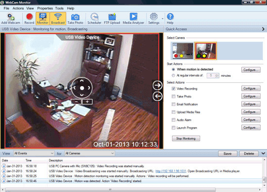 WebCam Monitor kann automatisch aufgezeichnete Video-, Audio- und Snapshots auf einen Server hochladen. PLATZVideo kann auch live über das Internet gestreamt werden, so dass Sie Ereignisse von jedem Computer mit einer Internetverbindung überwachen können. Professionelle Sicherheitsfunktionen beinhalten das automatische Zeitstempeln von aufgenommenen Videos und Schnappschüssen. Alle überwachten Aktivitäten werden in einem Ereignisprotokoll zur schnellen Referenz angezeigt. Mit der Funktion "Auto Delete" können Sie eine Anzahl von Aufzeichnungen und "Snaps" speichern, ohne zu riskieren, Ihre Festplatte zu füllen und ohne Dateien manuell zu verfolgen und zu löschen.