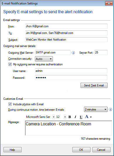 Die E-Mail-Benachrichtigung ist ein effektiver Weg, um remote zu überwachen. Immer wenn eine Warnung ausgelöst wird, entweder bei Bewegungserkennung oder im regelmäßigen Intervall, WebCam Monitor sendet Ihnen sofort eine E-Mail. PLATZSie können auch wählen, um JPEG-Fotos der Aktivität, die die Warnung ausgelöst, innerhalb der E-Mail-Körper.
