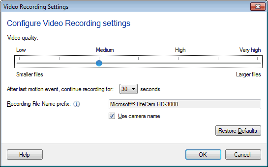 Standardmäßig ist Ihr Webcam Videos werden mit einer Bitrate von 700 kbps aufgezeichnet. Sie können die Bitrate als 500, 600, 700, 850, 1000, 1125 oder 1250kbps auswählen. Die Qualität der Aufnahme hängt von der Bitrate ab, die Sie auswählen. Hohe Bitraten führen zu klaren und scharfen Aufnahmen, aber großen Dateigrößen. Niedrige Bitraten geben kleine Dateigrößenaufnahmen, aber die Qualität kann reduziert werden. Im Allgemeinen sollten Sie hohe Bitraten mit hochauflösenden Kameras und hohen Bildraten verwenden. Wenn Sie eine niedrigauflösende Kamera und niedrige Bildraten haben, werden mit niedrigeren Bitraten akzeptable Aufnahmen gegeben.