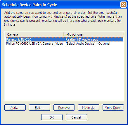 Die vollständige Liste der Gerät-Paare, die Sie, um den Zeitplan hinzugefügt erscheint der Zeitplan Gerät Paaren im Zyklus Dialog. Um einen Eintrag zu ändern, wählen Sie ihn aus, und klicken Sie auf Bearbeiten. Um einen Eintrag zu löschen, markieren Sie es und klicken Sie auf Entfernen. Verwendung der Nach oben und Nach unten Tasten, um die Reihenfolge der Paare Gerät im Zyklus zu ändern.