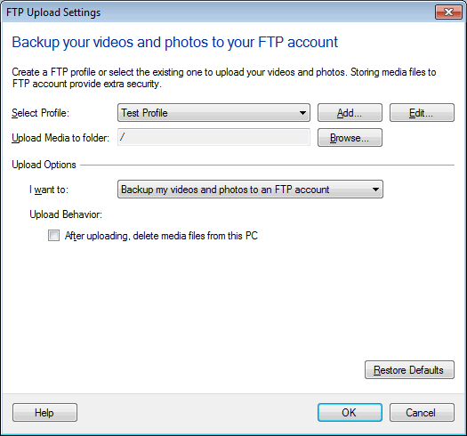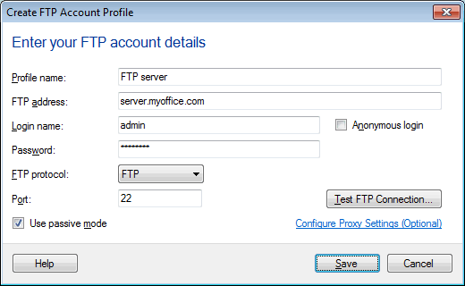 Klicken Sie auf Hinzufügen Schaltfläche, um ein neues FTP-Profil zu erstellen. Zu Bearbeiten ein FTP-Account-Einstellungen, wählen Sie das FTP-Profil aus dem Drop nach unten. Wenn Sie auf die Schaltfläche Hinzufügen oder bearbeiten klicken, erscheint folgender Dialog:
