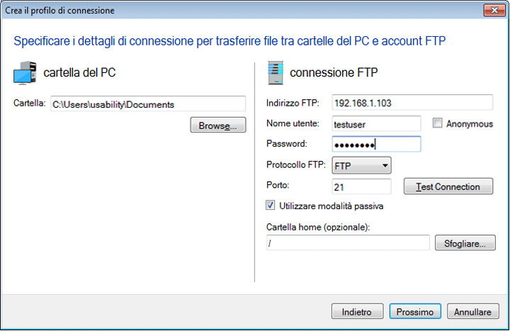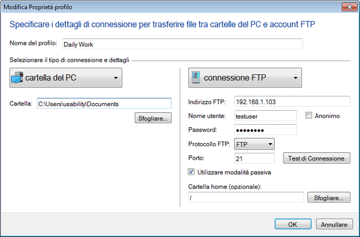 | Impostazioni di connessione FTP corrette automaticamente | | |