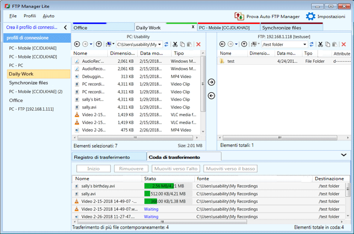 La Coda di trasferimento visualizza l'elenco dei file da trasferire in ordine. Trascina semplicemente i file nella Coda di trasferimento e avvia il trasferimento con un solo clic. Puoi mettere in pausa o riavviare i trasferimenti in qualsiasi momento. Se si verifica un problema di rete, FTP Manager Lite si ricollegherà automaticamente e riprenderà il trasferimento non appena la connessione sarà disponibile. Un file di registro memorizza tutti i dettagli dei trasferimenti di dati con data e ora.