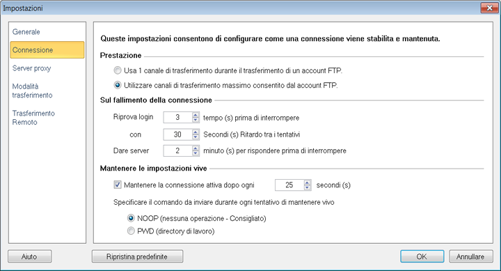 Nota: alcuni server FTP non supportano il comando NOOP e possono chiudere la connessione anche dopo aver ricevuto regolarmente il comando NOOP FTP. Per tali server FTP, si consiglia di utilizzare il comando PWD per Keep Alive.