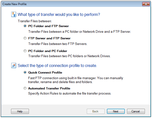 Si dovrebbe cominciare con la creazione di un profilo per ogni server FTP che lavorerete con.  Profilo contiene le informazioni necessarie per connettersi al server.  È possibile creare 3 tipi di profili: Profilo Quick Connect, Automated Transfer profilo e profilo prevista.