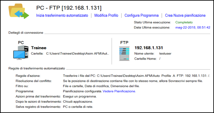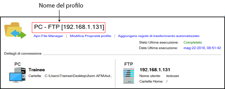 La pagina Informazioni profilo visualizza le informazioni sul tuo profilo, come il tipo di trasferimento, la fonte, la posizione di destinazione e l'ultima data connessa. Per visualizzare le proprietà della connessione, fare clic con il pulsante destro del mouse su un profilo Pannello dei profili di connessione e selezionare Informazioni del profilo.