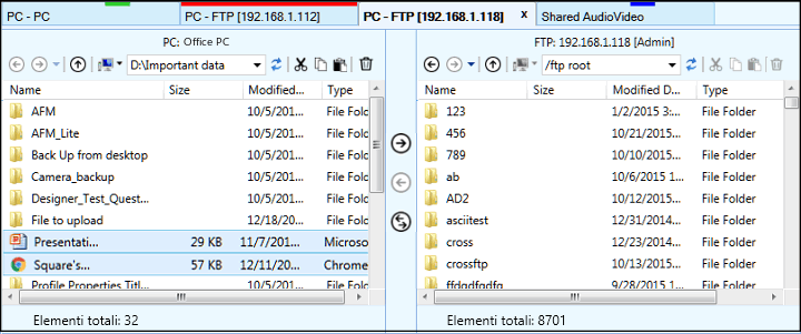 Il pannello di trasferimento fornisce un modo semplice e facile per trasferire file dal lato sinistro al lato destro o viceversa.