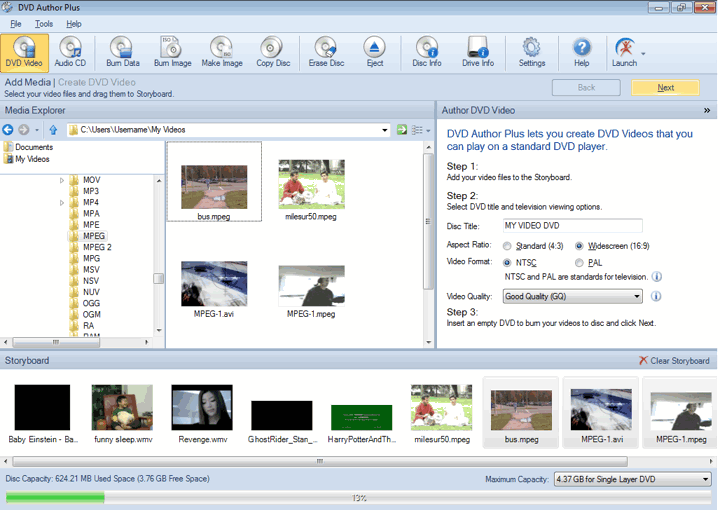 Per creare un DVD, aggiungere i file video per il storyboard da Media Explorer. Lo storyboard è un organizzatore grafico che visualizza le miniature dei file da aggiungere. È possibile trascinare i file da Esplora risorse di supporto e rilasciarli allo storyboard. Pre-visualizzare i file nello storyboard prima di procedere alla fase successiva.