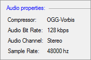 Per impostazione predefinita, il compressore selezionato è OGG-Vorbis. La frequenza è impostata a 48000 Hz, Bitrate a 128 Kbps e canale audio Stereo.