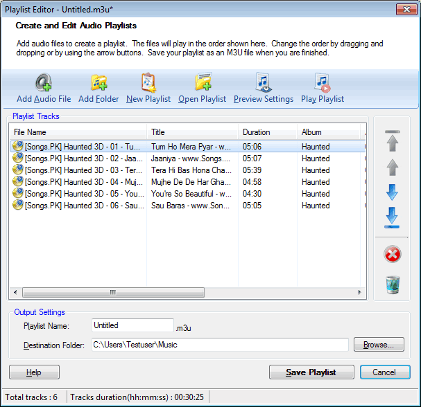 Puoi Aggiungere file audio o cartelle Contenente i file audio dal tuo PC per creare una playlist. Quando si aggiunge una cartella, è possibile scegliere di includere i file musicali anche dalle sue sottocartelle. È possibile iniziare a creare una Nuova playlist o Aperto Una playlist esistente. Scegliere l'ordine delle tracce per la riproduzione riordinandole. Utilizzare i pulsanti freccia presenti sul lato destro dell'Editor di Playlist. Oltre al riallineamento, è anche possibile rimuovere una particolare traccia o tutte le tracce dalla playlist.