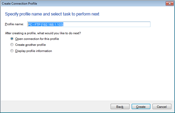 Fornire un Nome del profilo per la tua connessione. Oltre al nome del profilo, puoi scegliere alcune attività veloci da eseguire successivamente. Selezionare Connessione aperta per questo profilo, per aprirlo File Manager e inizia immediatamente a trasferire i tuoi file. Se devi creare più profili di trasferimento, scegli l'opzione Crea un altro profilo. Per visualizzare i dettagli della connessione di questo profilo senza eseguire ulteriori azioni, selezionare l'opzione Visualizza le informazioni del profilo. Questo si aprirà Informazioni del profilo pagina di questo profilo. Fai clic sul pulsante Crea e il tuo profilo viene salvato ed elencato nel Pannello dei profili di connessione.