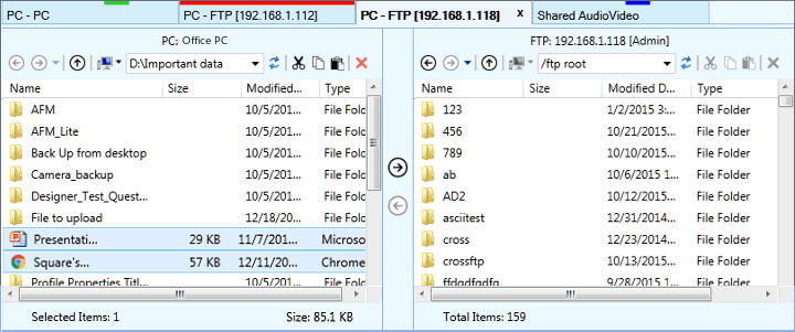 Il pannello di trasferimento fornisce un modo semplice e facile per trasferire file dal lato sinistro al lato destro o viceversa.