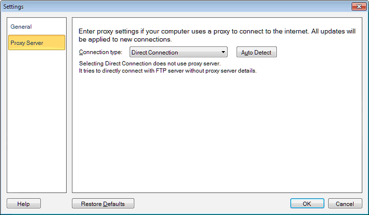 Un server proxy ti consente di connetterti al server di destinazione usando come livello intermedio. Invia le tue richieste al server di destinazione e restituisce la risposta a te. FTP Manager Lite consente di connettersi tramite proxy proxy 4 e 5, HTTP o connessione proxy FTP. Se si è dietro un server proxy, configurare queste impostazioni nell'applicazione, per connettersi al server FTP.