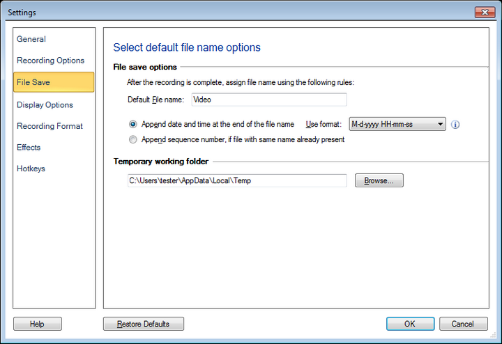 I file creati durante la registrazione dello schermo sono memorizzati nell'unità C: \ in una cartella temporanea.Nella Figura 1, i file sono archiviati in C: \ Users \ tester \ AppData \ Local \ Temp. Puoi cliccare Navigare selezionare una cartella diversa per salvare i file temporanei.