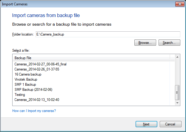 È possibile importare le impostazioni della fotocamera dalla versione precedente di Security Monitor Pro. Per ripristinare la (e) camera (e) da un file di backup, fare clic su File >> Importa telecamere.