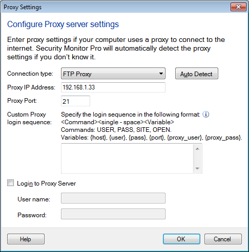 - Sequenza di login proxy personalizzato: Se selezionato Tipo di connessione = FTP allora questo campo è visibile.Questa sequenza di login indica al proxy, come connettersi al server FTP.Specificare la sequenza di accesso in formato: <Comando > <Singolo spazio > <Variabile > .
