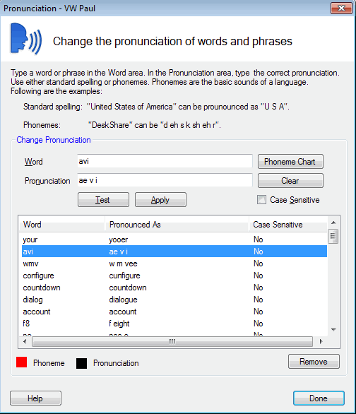 Inserire i fonemi per la parola e fare clic Test sentire la pronuncia. Potrebbe essere necessario regolarlo, ad esempio sostituendo una vocale diversa o cambiando il enfasi (stress).